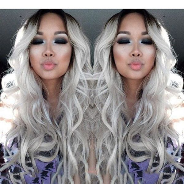 Wigs Difei Long Wavy Black To Silver Grey Wig Black Root Ombre